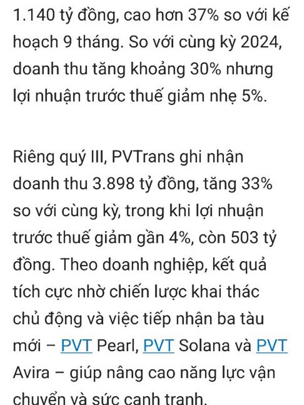 Tin vịt bà con ah trên web pvt lợi nhuận trước thuế quý 3 hơn 500 tỷ thì lợi nhuận sau thuế phải cỡ 400 tỷ. Nhưng vậy là kém năm ngoái một chút nên cổ đi ngang thôi