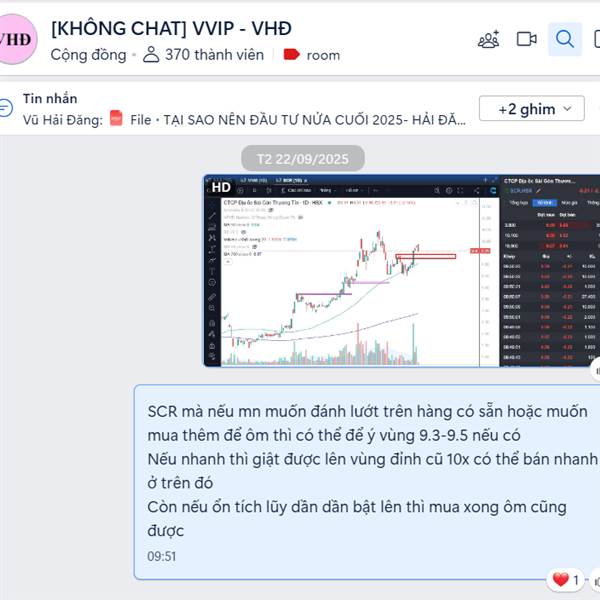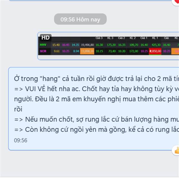 sáng nay e cũng lướt với một nửa hàng mua thêm SCR hôm nọ, mua 9.3 bán 9,7 thôi, phần còn lại vẫn tập trung mà nắm giữ