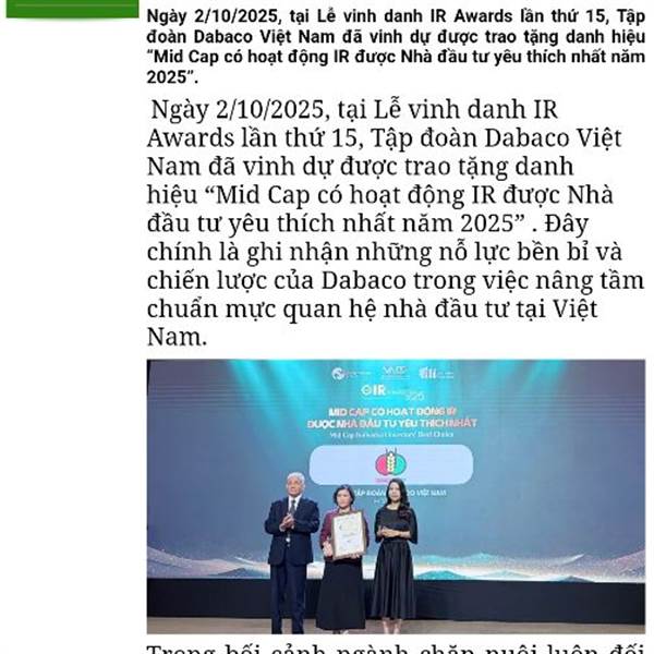 Dabaco, vinh, dự, nhận, giải, thưởng, IR, Awards, 2025:, Khẳng, định, tầm, vóc, doanh, nghiệp, nông, nghiệp, hàng, đầu., , ,