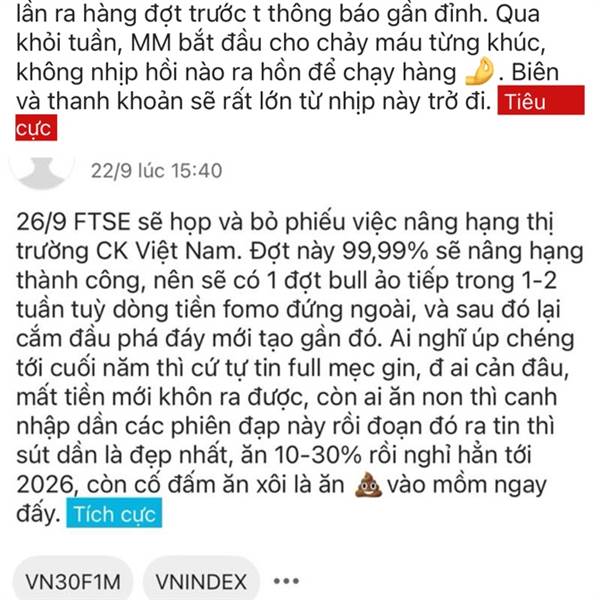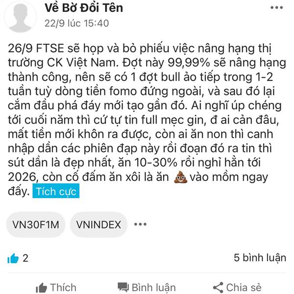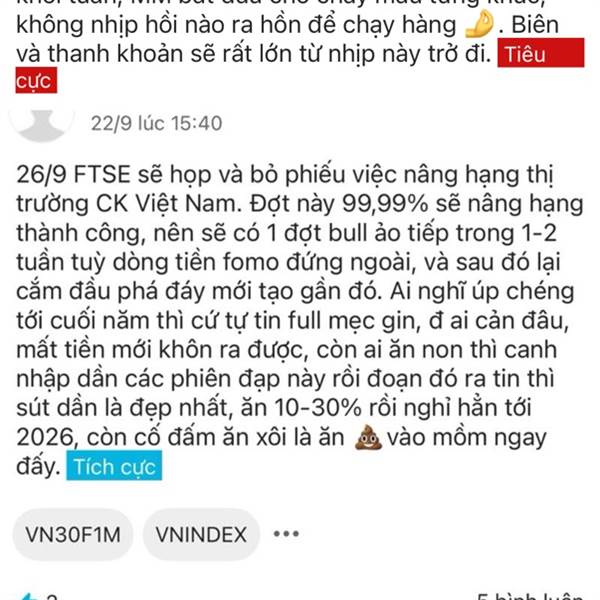 26/9 FTSE sẽ họp và bỏ phiếu việc nâng hạng thị trường CK Việt Nam. Đợt này 99,99% sẽ nâng hạng thành công, nên sẽ có 1 đợt bull ảo tiếp trong 1-2 tuần tuỳ dòng tiền fomo đứng ngoài, và sau đó lại cắm...Thêm