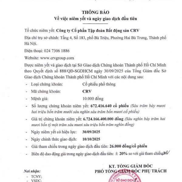 CRV có ngày niêm yết lên sàn HOSE chính thức từ ngày 10/10