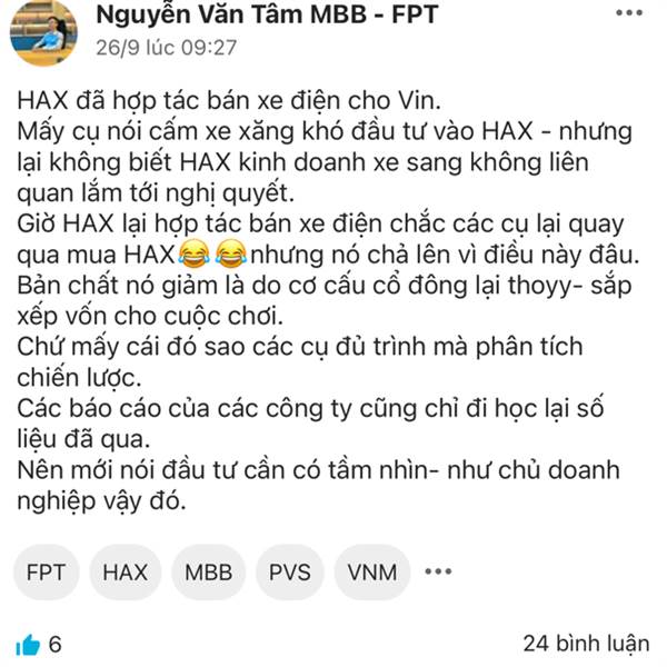 HAX đã hợp tác bán xe điện cho Vin. Mấy cụ nói cấm xe xăng khó đầu tư vào HAX - nhưng lại không biết HAX kinh doanh xe sang không liên quan lắm tới nghị quyết. Giờ HAX lại hợp tác bán xe điện chắc các c...Thêm