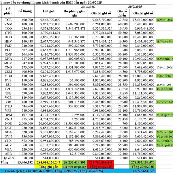 BMI chốt sổ danh mục đầu tư ngày 30/9 chênh lệch tăng so với ngày 30/6 là 48.7 tỷ.