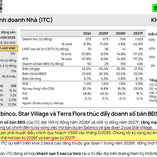 Trong báo cáo tháng 9, VietCap định giá ITC 22k cho 2026 với kỳ vọng xong pháp lý và mở bán Sabinco và Star Village. Mua ITC hiện tại giá 14, sang 2026 bán giá 22, biên lợi nhuận cũng tốt đó chứ