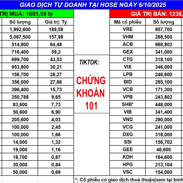 Ngày 6/10/2025 tự doanh MUA ròng: 446.84 tỷ (bao gồm khớp lệnh và thỏa thuận)