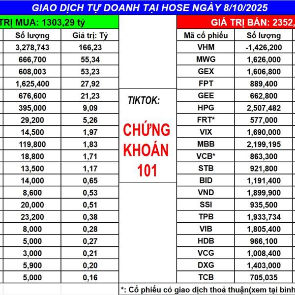 Ngày 8/10/2025 tự doanh BÁN ròng: -1049.24 tỷ (bao gồm khớp lệnh và thỏa thuận)