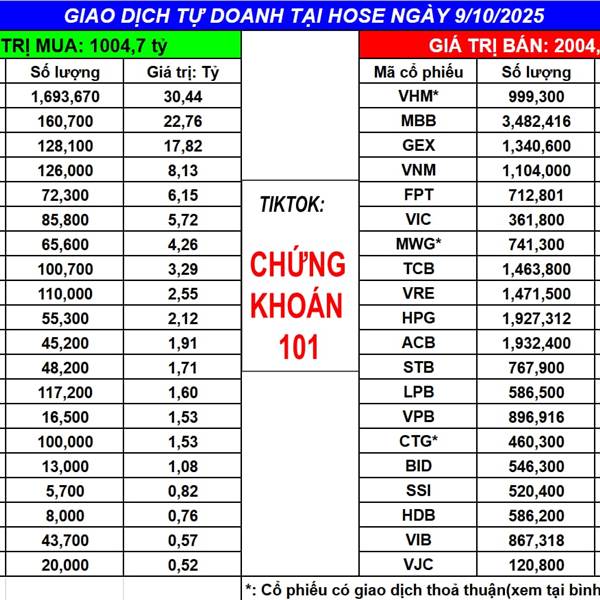 Ngày 9/10/2025 tự doanh BÁN ròng: -1000.06tỷ (bao gồm khớp lệnh và thỏa thuận)