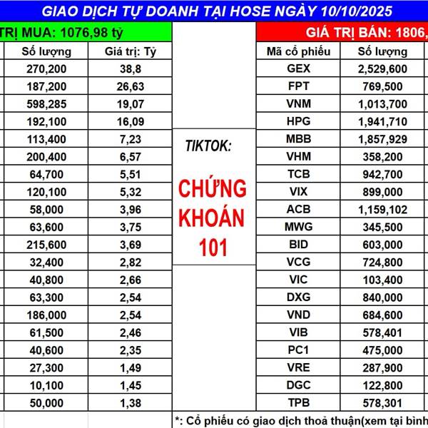 Ngày 7/10/2025 tự doanh MUA ròng: 127.75 tỷ (bao gồm khớp lệnh và thỏa thuận)